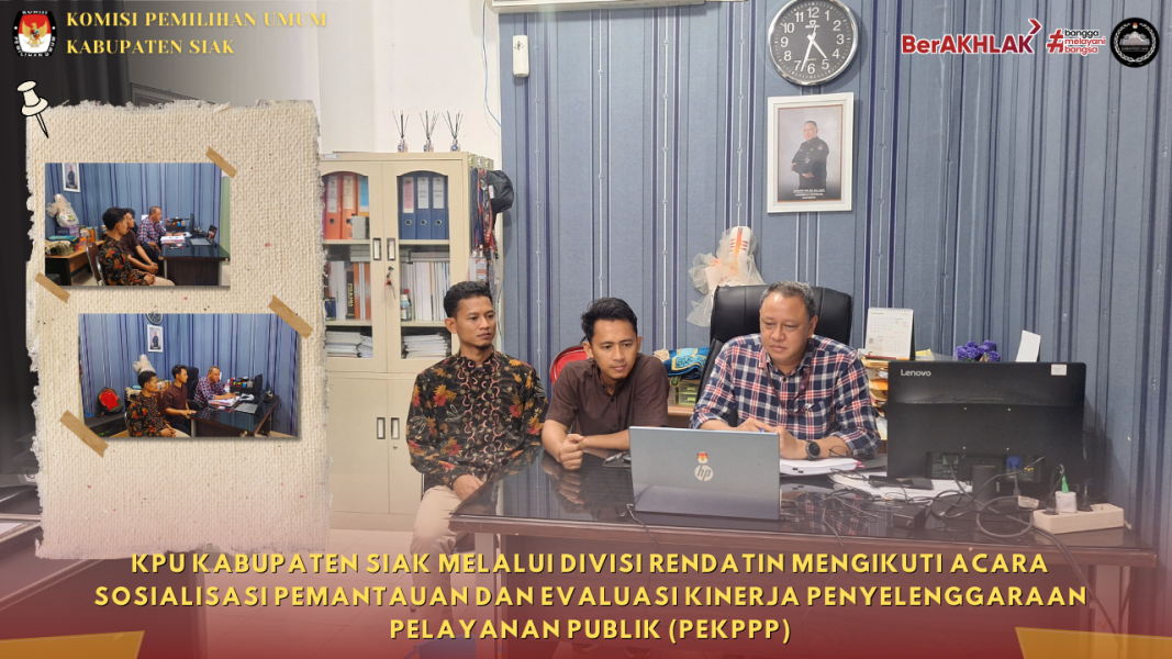 Siak, 18 September 2025 – Komisi Pemilihan Umum (KPU) Kabupaten Siak melalui Divisi Rendatin mengikuti kegiatan Sosialisasi Pemantauan dan Evaluasi Kinerja Penyelenggaraan Pelayanan Publik (PEKPPP) Mandiri Instansional 2025 yang diselenggarakan oleh KPU RI secara daring melalui Zoom Meeting. Kegiatan ini diikuti oleh Kasubbag Rendatin KPU Kabupaten Siak beserta staf, bersama jajaran KPU se-Indonesia.