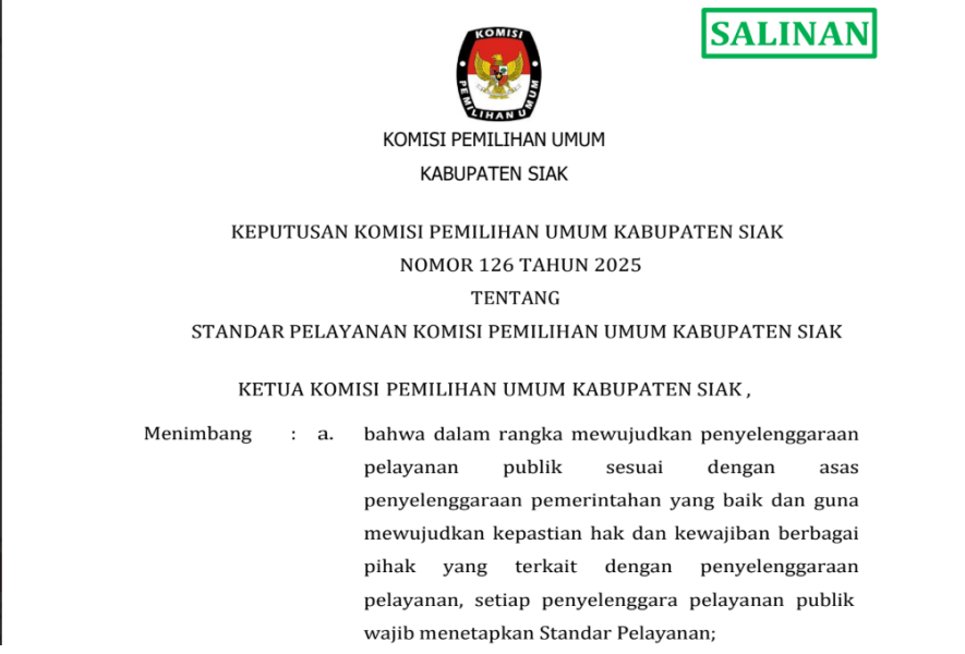 Siak Sri Indrapura, 18 September 2025 – Komisi Pemilihan Umum (KPU) Kabupaten Siak resmi menetapkan Keputusan KPU Kabupaten Siak Nomor 126 Tahun 2025 tentang Standar Pelayanan.