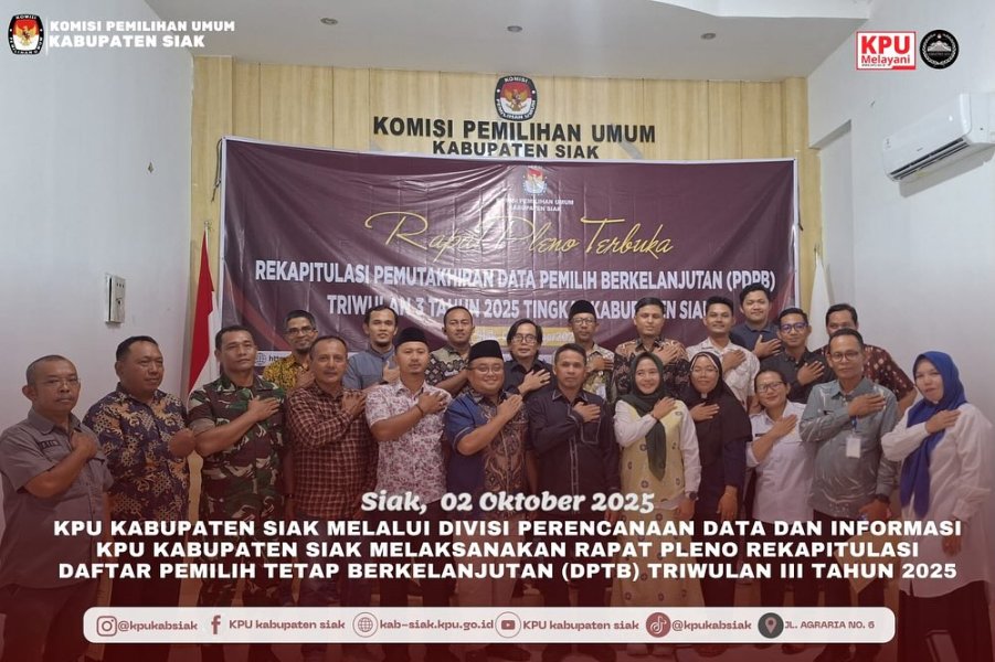 Komisi Pemilihan Umum (KPU) Kabupaten Siak menyelenggarakan Rapat Pleno Terbuka Rekapitulasi Pemutakhiran Data Pemilih Berkelanjutan (PDPB) Triwulan III Tahun 2025 pada Kamis, 2 Oktober 2025, bertempat di Aula Kantor KPU Kabupaten Siak.