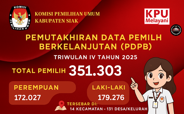 KPU Kabupaten Siak menyampaikan apresiasi atas dukungan para pemangku kepentingan dalam penyelenggaraan pemutakhiran data pemilih. KPU Kabupaten Siak menegaskan bahwa kegiatan pemutakhiran data pemilih merupakan tugas yang dilaksanakan secara berkelanjutan setiap bulan untuk memastikan data selalu mutakhir, akurat, dan siap digunakan pada seluruh tahapan pemilu maupun pemilihan.