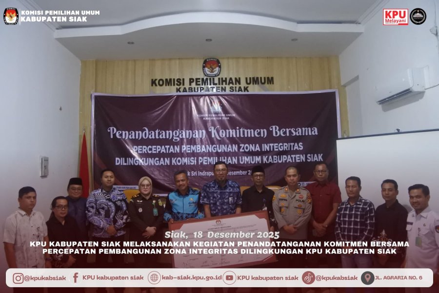 Siak Sri Indrapura, 18 Desember 2025 – Komisi Pemilihan Umum (KPU) Kabupaten Siak melaksanakan kegiatan Penandatanganan Komitmen Bersama Percepatan Pembangunan Zona Integritas (ZI) di lingkungan KPU Kabupaten Siak. Kegiatan ini berlangsung pada Kamis, 18 Desember 2025, bertempat di Aula Kantor KPU Kabupaten Siak.