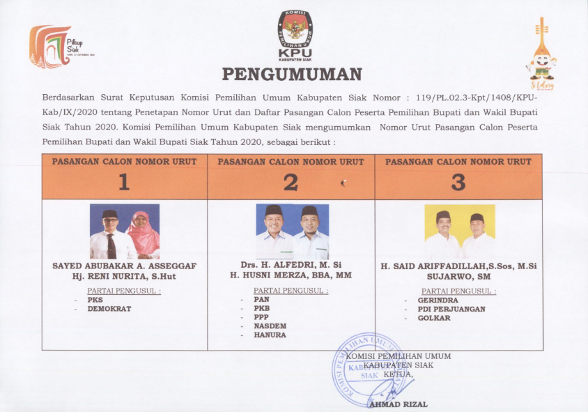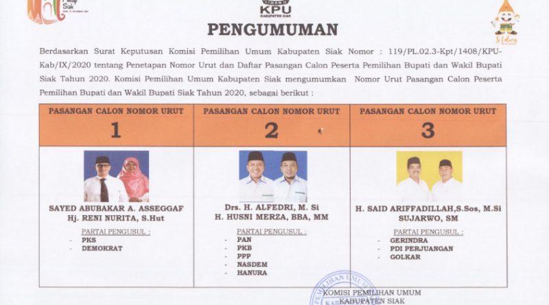 Pengumuman Nomor Urut Pasangan Calon Bupati dan Wakil Bupati Siak pada Pemilihan Serentak Lanjutan Tahun 2020