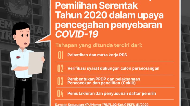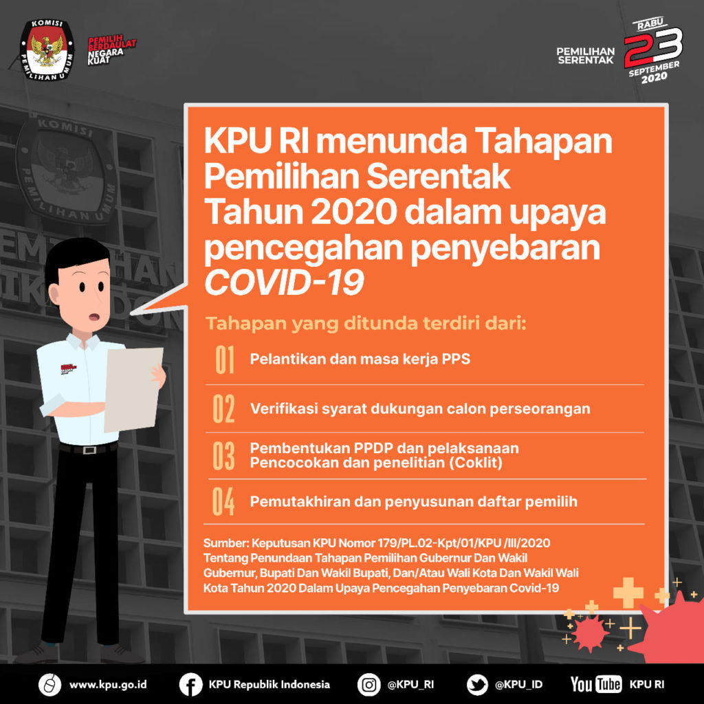 Dalam rangka pencegahan penyebaran Virus COVID-19, maka KPU RI telah memutuskan adanya penundaan terhadap beberapa Tahapan Pilkada 2020, keputusaan tersebut telah dituangkan dalam Surat Keputusan KPU Nomor 179/PL.02-Kpt/01/KPU/III/2020 tentang Penundaan Tahapan Pemilihan Gubernur dan Wakil Gubernur, Bupati dan Wakil Bupati, dan/ atau Walikota dan Wakil Walikota Tahun 2020 Dalam Upaya Pencegahan Penyebaran COVID-19. Ada 4 (empat) ruang lingkup tahapan yang mengalami penundaan, diantaranya :