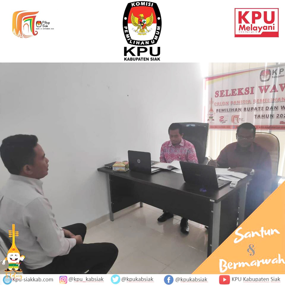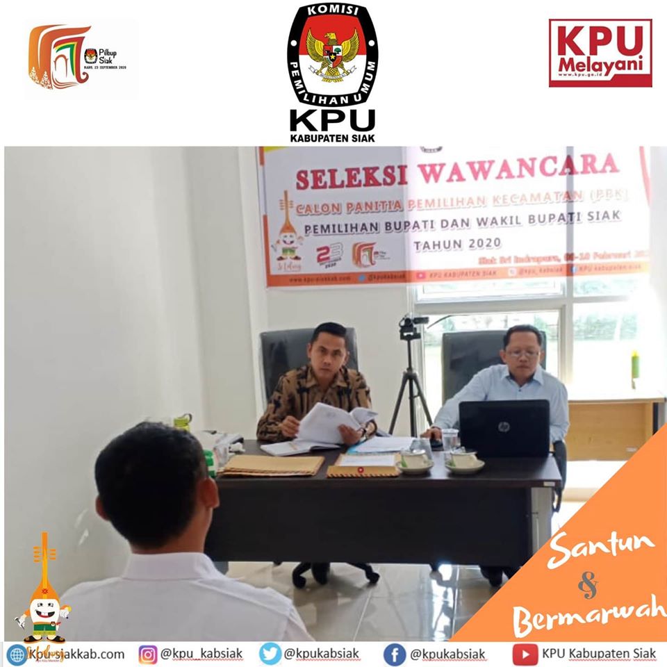KPU Kabupaten Siak melaksanakan seleksi wawancara pada Calon Anggota PPK yang lulus pada tes tertulis. Sebanyak 140 Peserta dari 14 Kecamatan di Kabupaten Siak yang lulus seleksi tertulis mengikuti seleksi wawancara yang dimulai pada tanggal 8-10 Februari 2020 dan dilaksanakan di kantor KPU Kabupaten Siak .