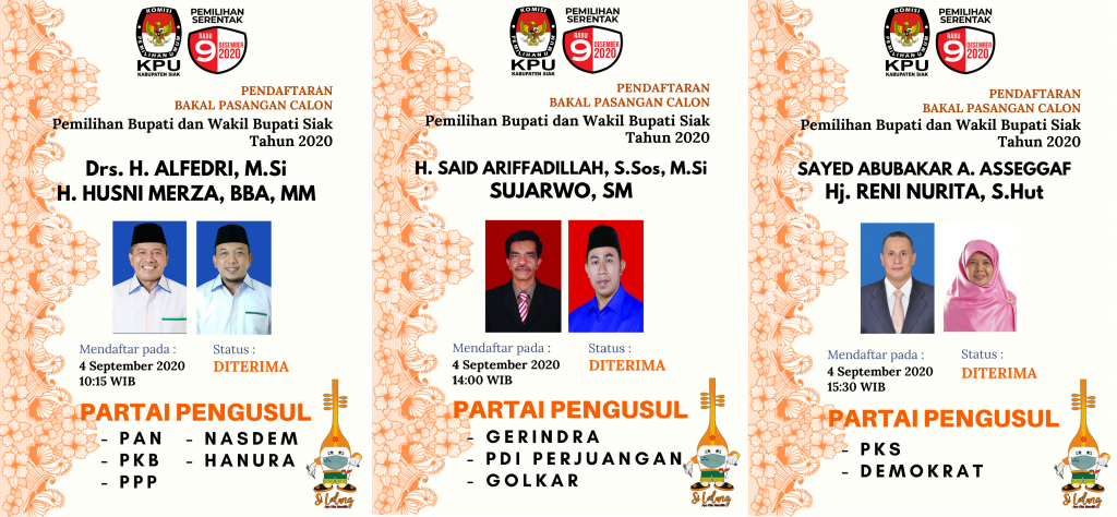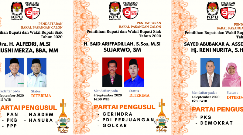 Jumat, 4 September 2020 kemarin, KPU Kabupaten Siak telah menerima Dokumen Pendaftaran Bakal Pasangan Calon Bupati dan Wakil Bupati Siak pada Pemilihan Serentak Lanjutan Tahun 2020.