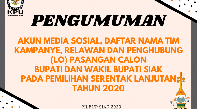Berikut diumumkan Akun Media Sosial, Daftar Nama Tim Kampanye, Relawan dan Penghubung LO Pasangan Calon Bupati dan Wakil Bupati Siak pada Pemilihan Serentak Lanjutan Tahun 2020