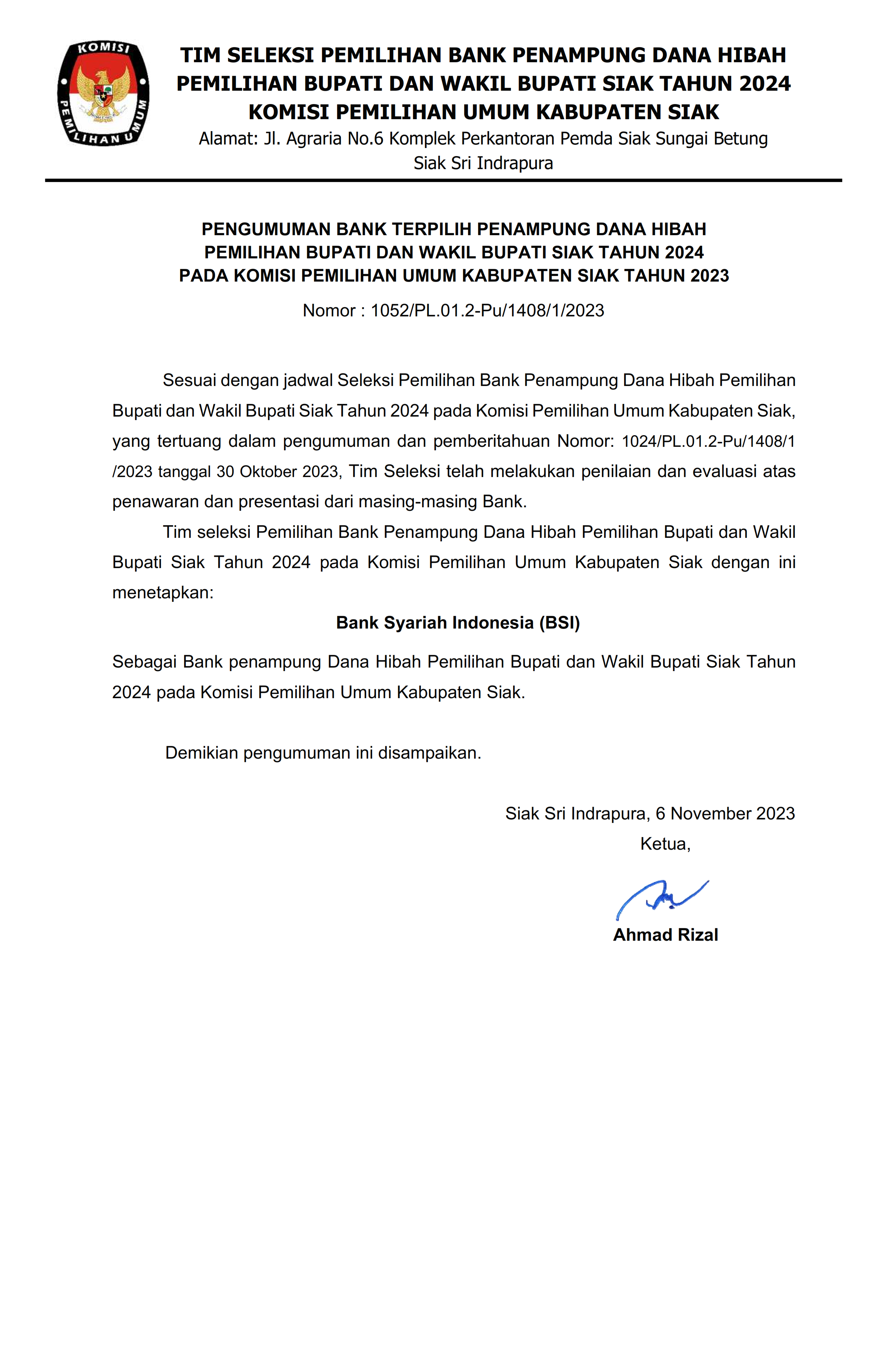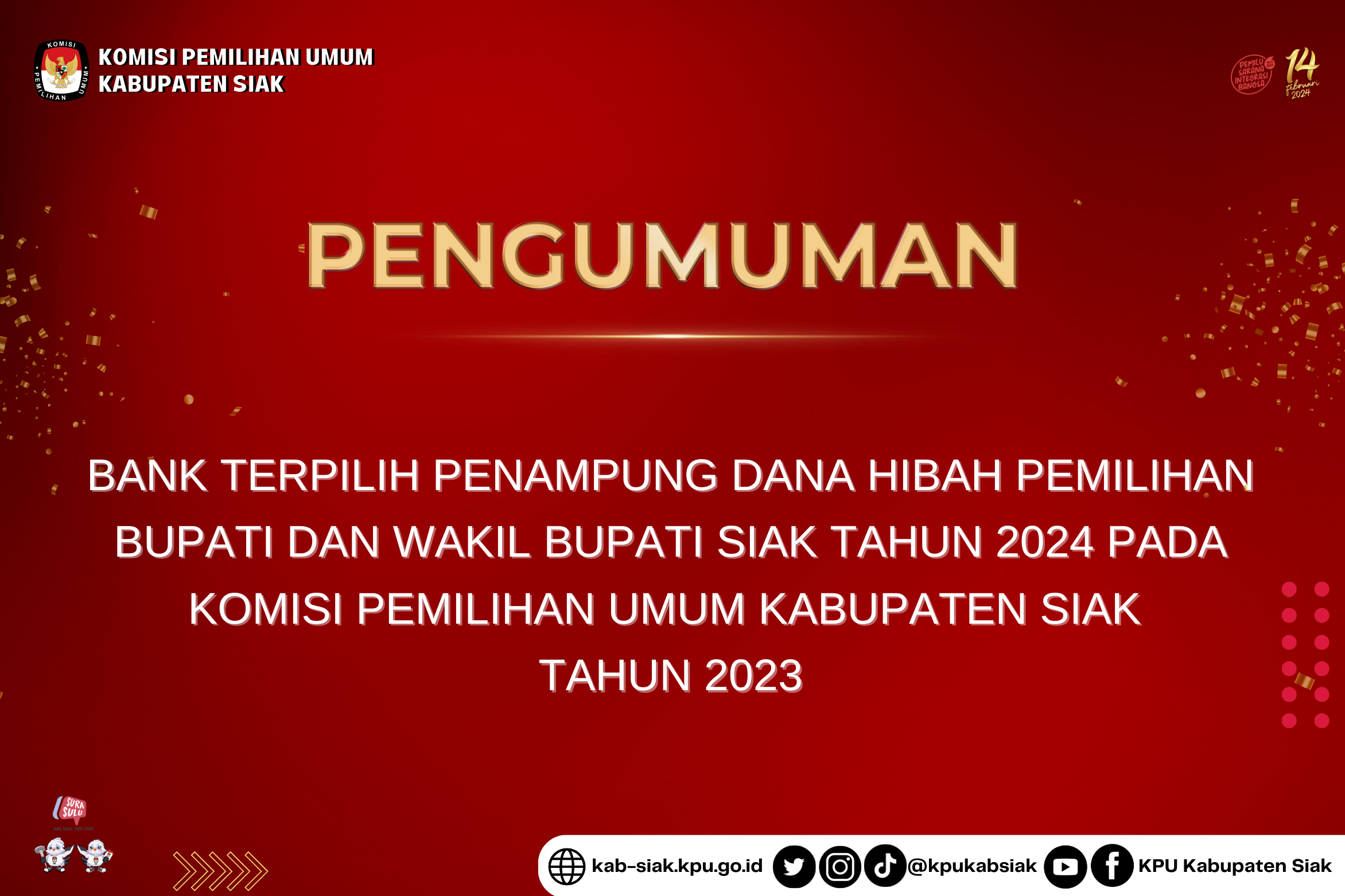 Pengumuman Bank Terpilih Penampung Dana Hibah Pemilihan Bupati dan Wakil Bupati Siak Tahun 2024 pada Komisi Pemilihan Umum Kabupaten Siak Senin, 06 November 2023 00:00 406 unduh disini Bagikan: Dilihat 406 Kali.
