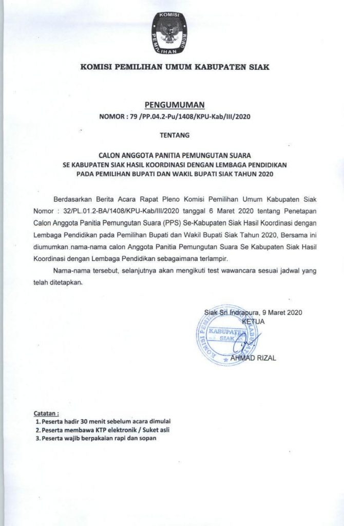 Pengumuman KPU Kabupaten Siak Nomor: 77/PP.04.2.Pu/1408/KPU-Kab/III/2020 Tentang Calon Anggota Pemungutan Suara (PPS) Se-Kabupaten Siak Hasil Koordinasi dengan Lembaga Pendidikan pada Pemilihan Bupati dan Wakil Bupati Siak Tahun 2020