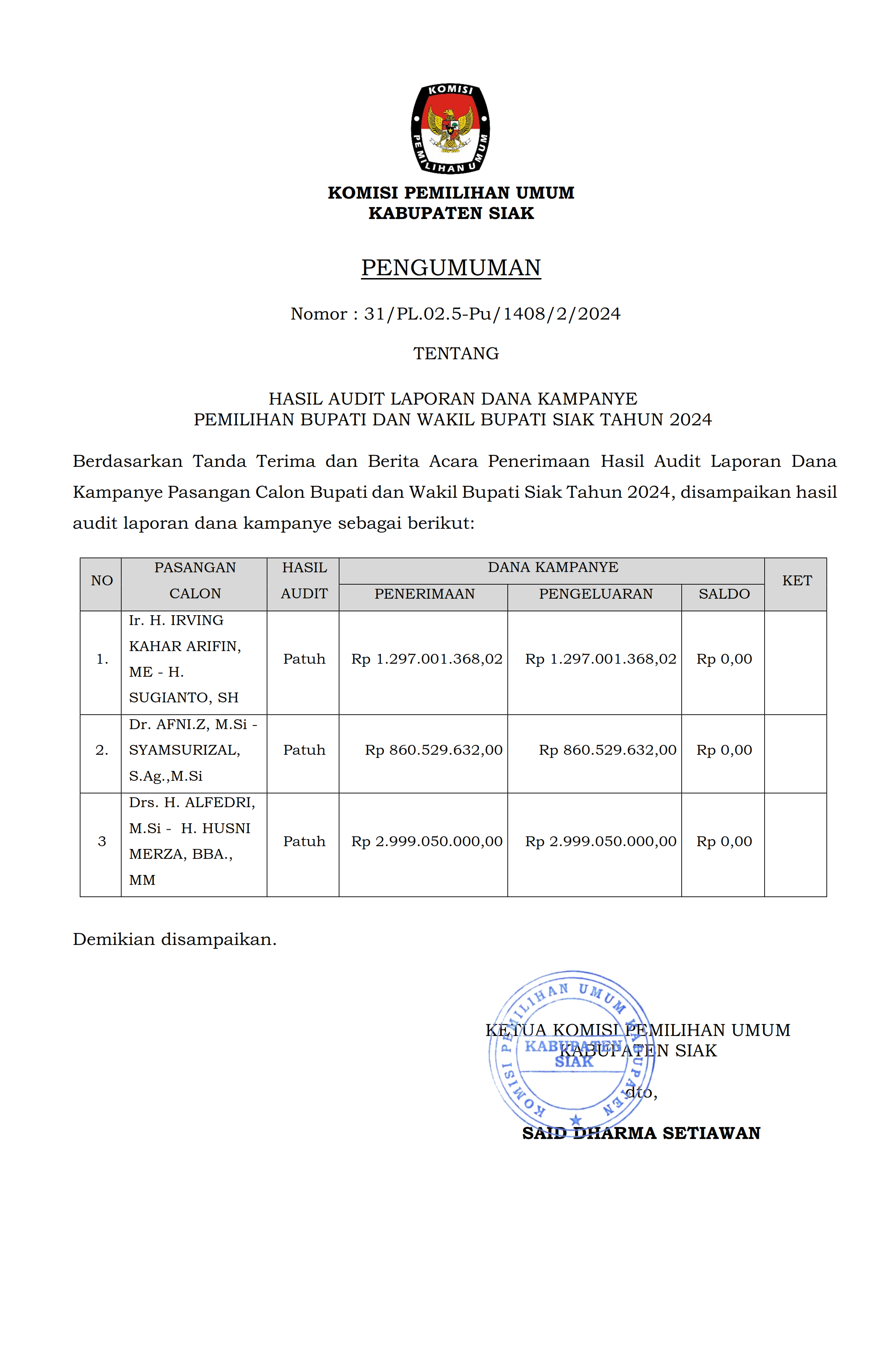 Pengumuman Hasil Audit Laporan Dana Kampanye Pemilihan Bupati dan Wakil Bupati Siak tahun 2024 dapat diunduh DISINI