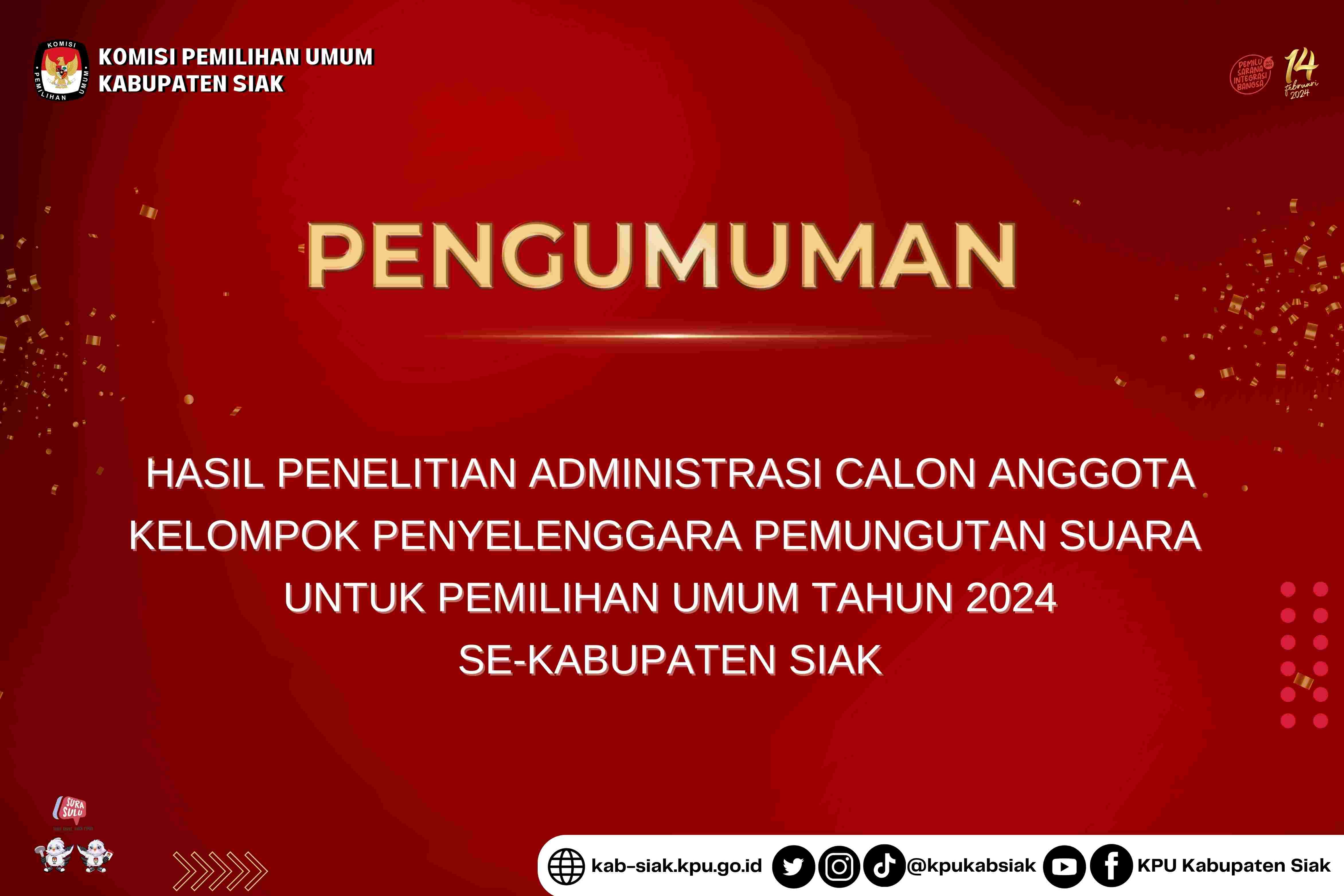 Pengumuman Hasil Penelitian Administrasi Calon Anggota Kelompok Penyelenggara Pemungutan Suara (KPPS) Pemilu Tahun 2024 Se-Kabupaten Siak
