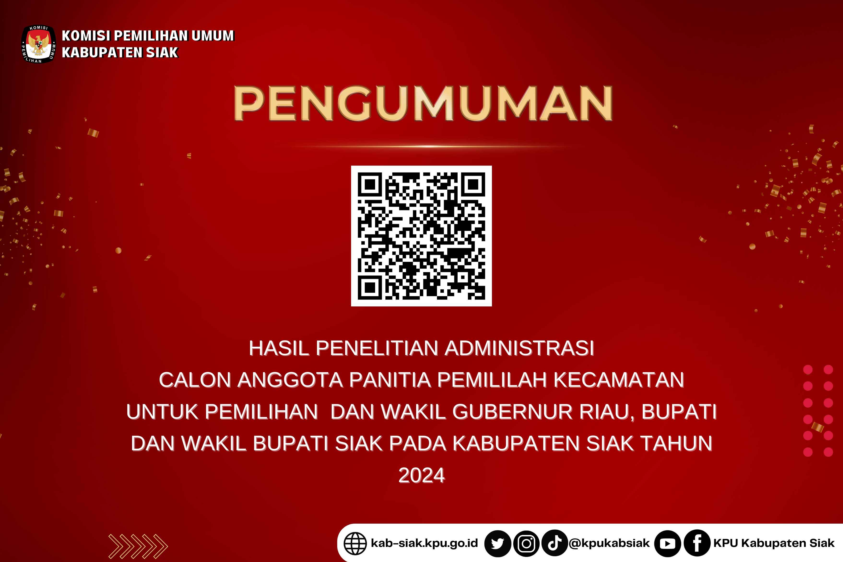Pengumuman Hasil Penelitian Administrasi Calon Anggota PPK untuk Pemilihan Gubernur dan Wakil Gubernur Riau, Bupati dan Wakil Bupati Siak Tahun 2024