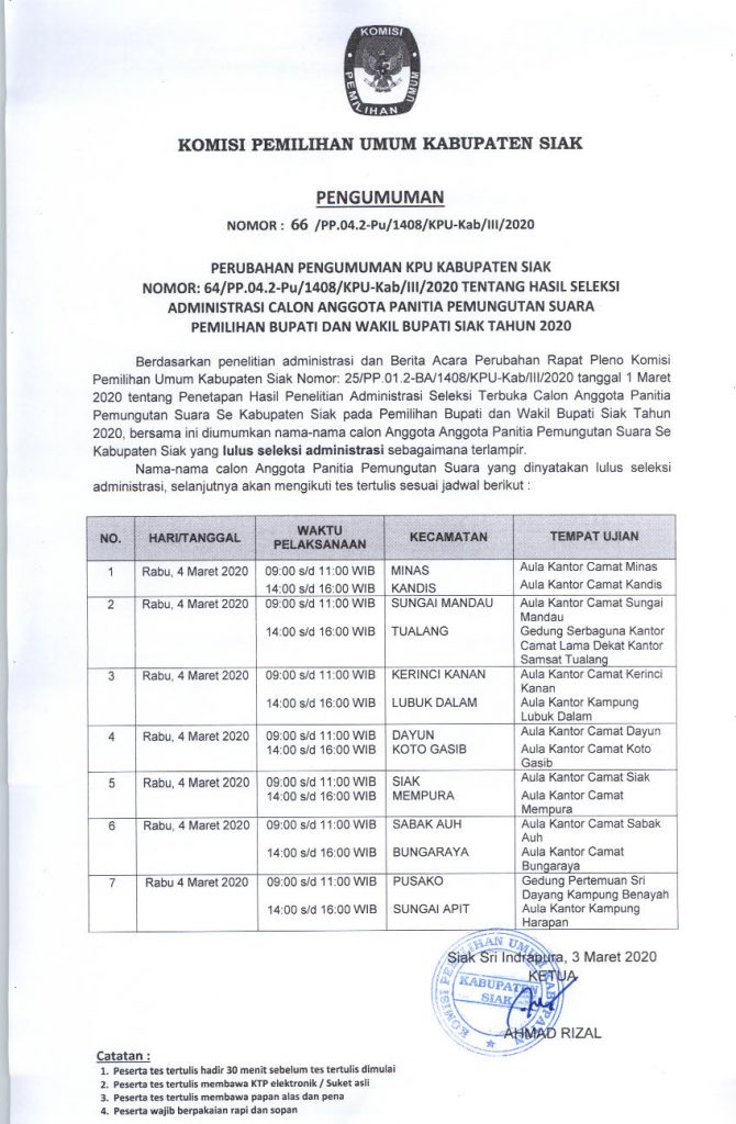 Pengumuman Hasil Seleksi Administrasi Calon Anggota Panitia Pemungutan Suara (PPS) Pilbup Siak Tahun 2020
