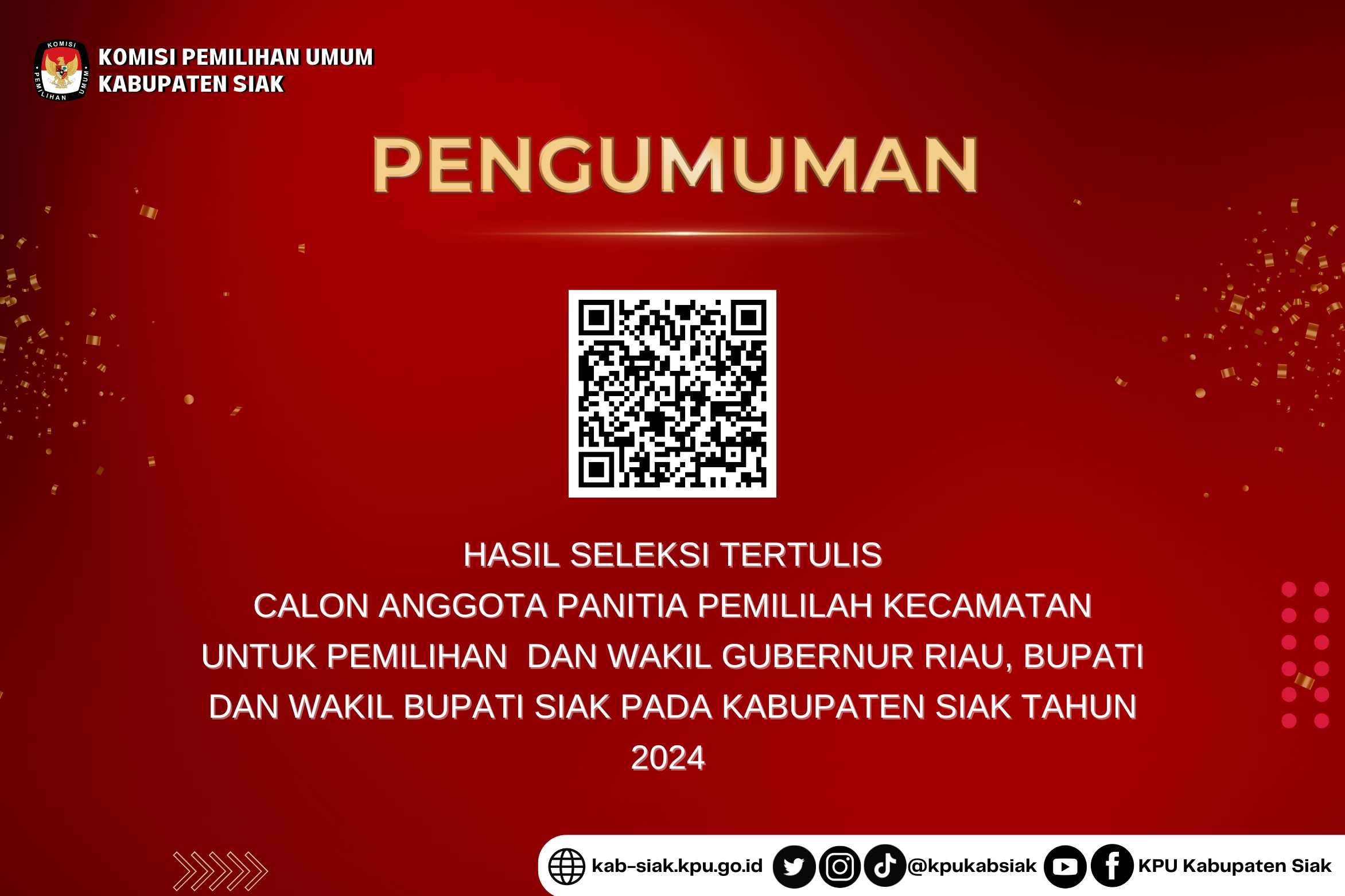 Pengumuman Hasil Seleksi Tertulis Calon Anggota PPK untuk Pemilihan Gubernur dan Wakil Gubernur Riau, Bupati dan Wakil Bupati Siak Tahun 2024
