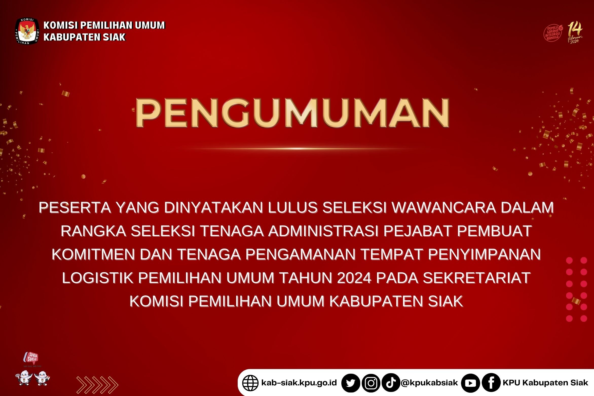 PESERTA YANG DINYATAKAN LULUS SELEKSI WAWANCARA DALAM RANGKA SELEKSI TENAGA ADMINISTRASI PEJABAT PEMBUAT KOMITMEN DAN TENAGA PENGAMANAN TEMPAT PENYIMPANAN LOGISTIK PEMILIHAN UMUM TAHUN 2024 PADA SEKRETARIAT KOMISI PEMILIHAN UMUM KABUPATEN SIAK