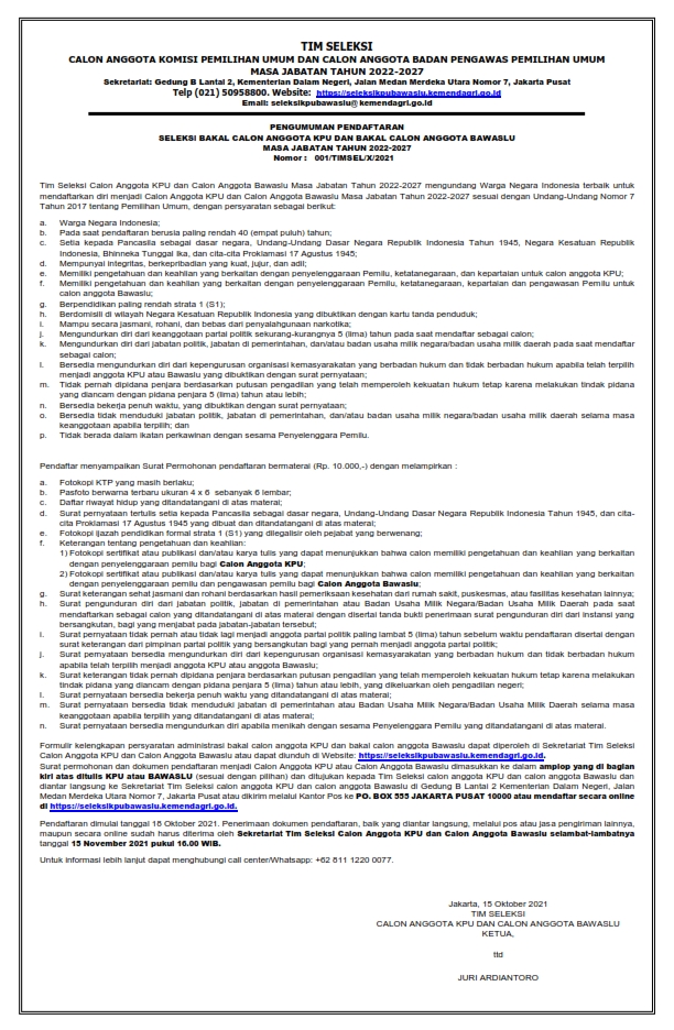 - Keterangan Pers Tim Seleksi Calon Anggota KPU dan BAWASLU Masa Jabatan Tahun 2022-2027 Tentang Pengumuman Pendaftaran Calon Anggota KPU dan Calon Anggota BAWASLU
