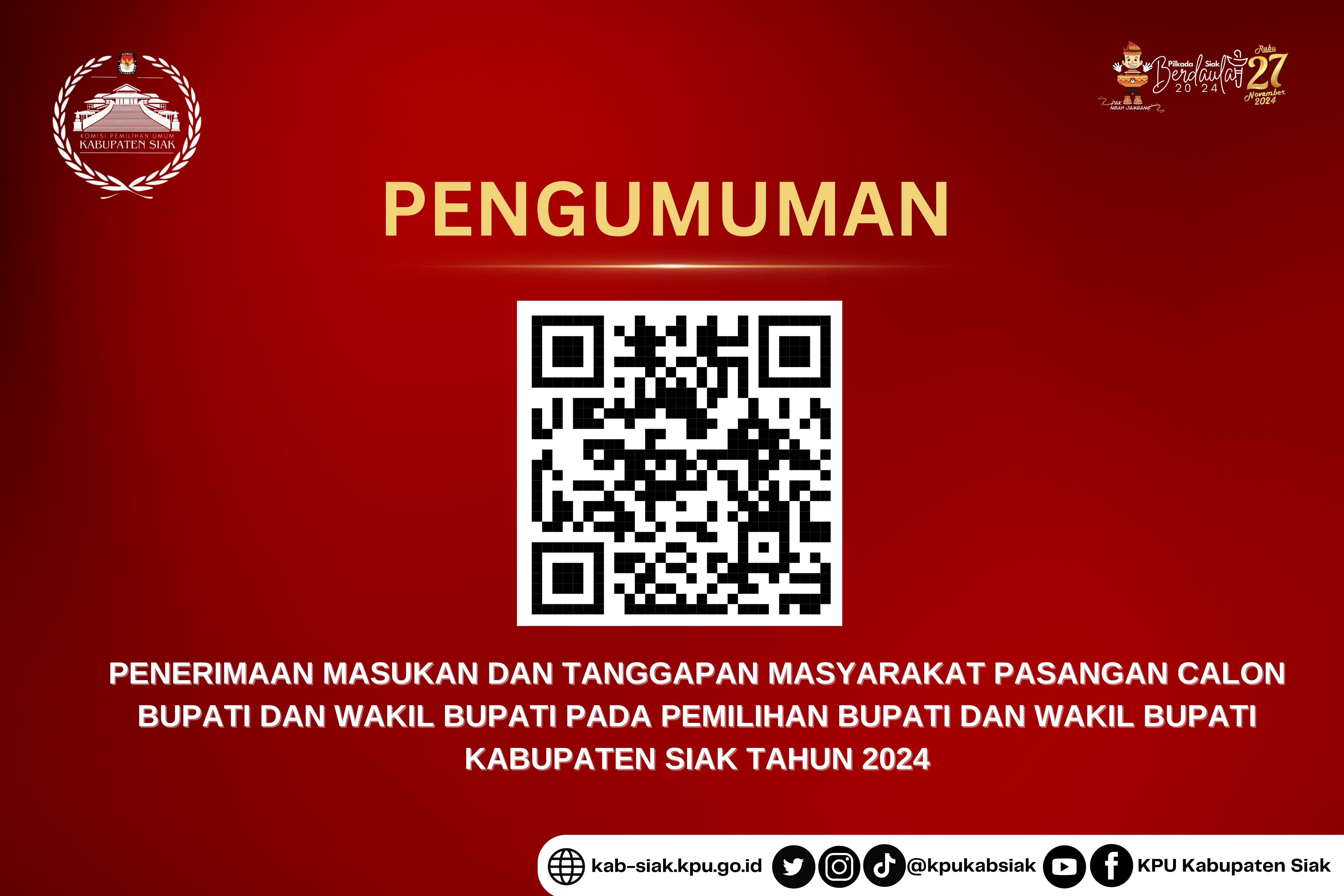 Berikut kami umumkan Penerimaan masukan dan tanggapan masyarakat Pasangan Calon Bupati dan Wakil Bupati Kabupaten Siak Tahun 2024. Pengumuman dan Form Tanggapan Masyarakat dapat di Download disini