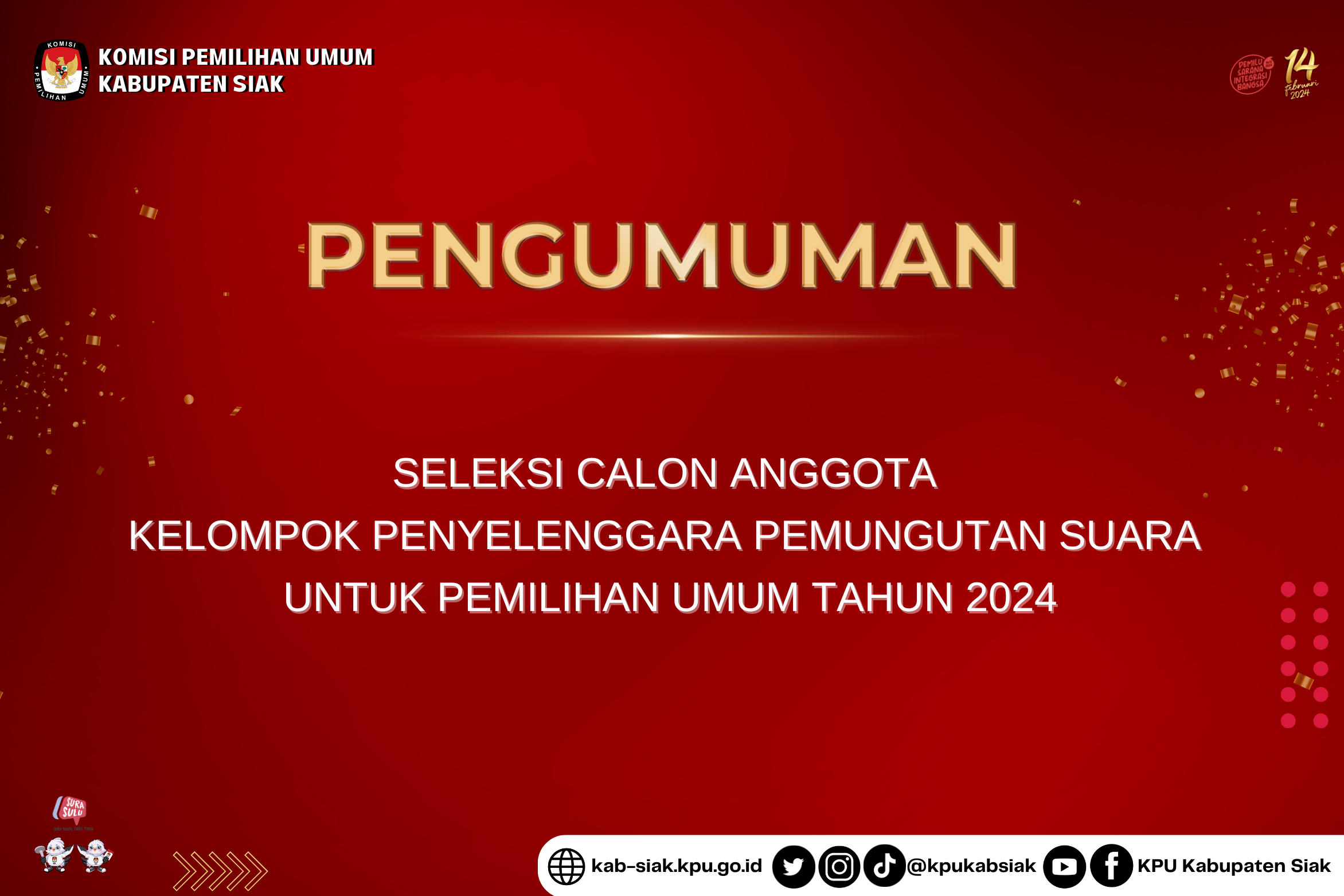 Dalam rangka pembentukan Kelompok Penyelenggara Pemungutan Suara (KPPS) untuk Pemilihan Umum Tahun 2024, Komisi Pemilihan Umum Kabupaten Siak mengundang Warga Negara Indonesia yang memenuhi persyaratan untuk mendaftarkan diri menjadi anggota KPPS untuk Pemilihan Umum Tahun 2024 dengan ketentuan sebagai berikut: