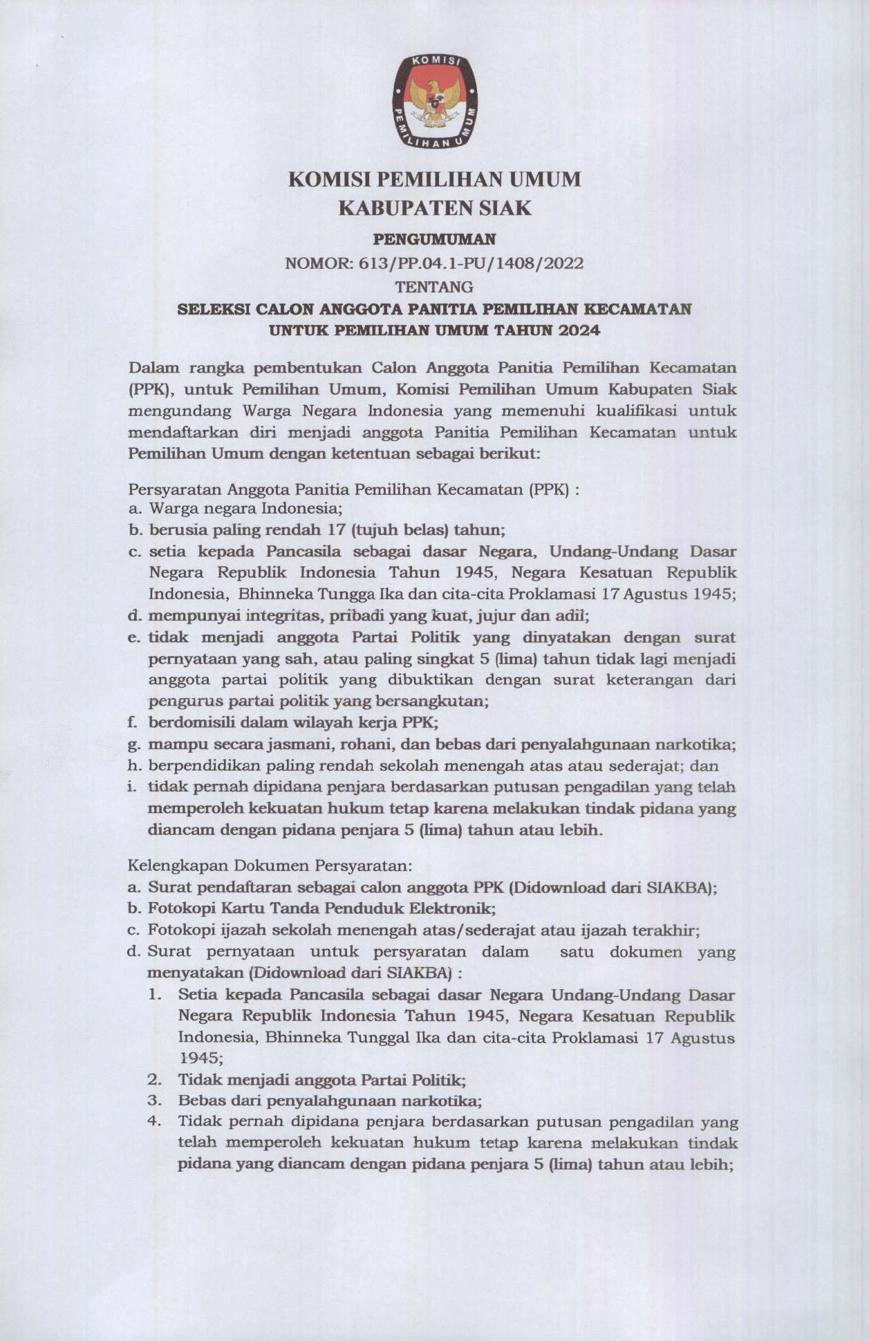 Pengumuman Seleksi Calon Anggota Panitia Pemilihan Kecamatan (PPK) untuk Pemilu Tahun 2024