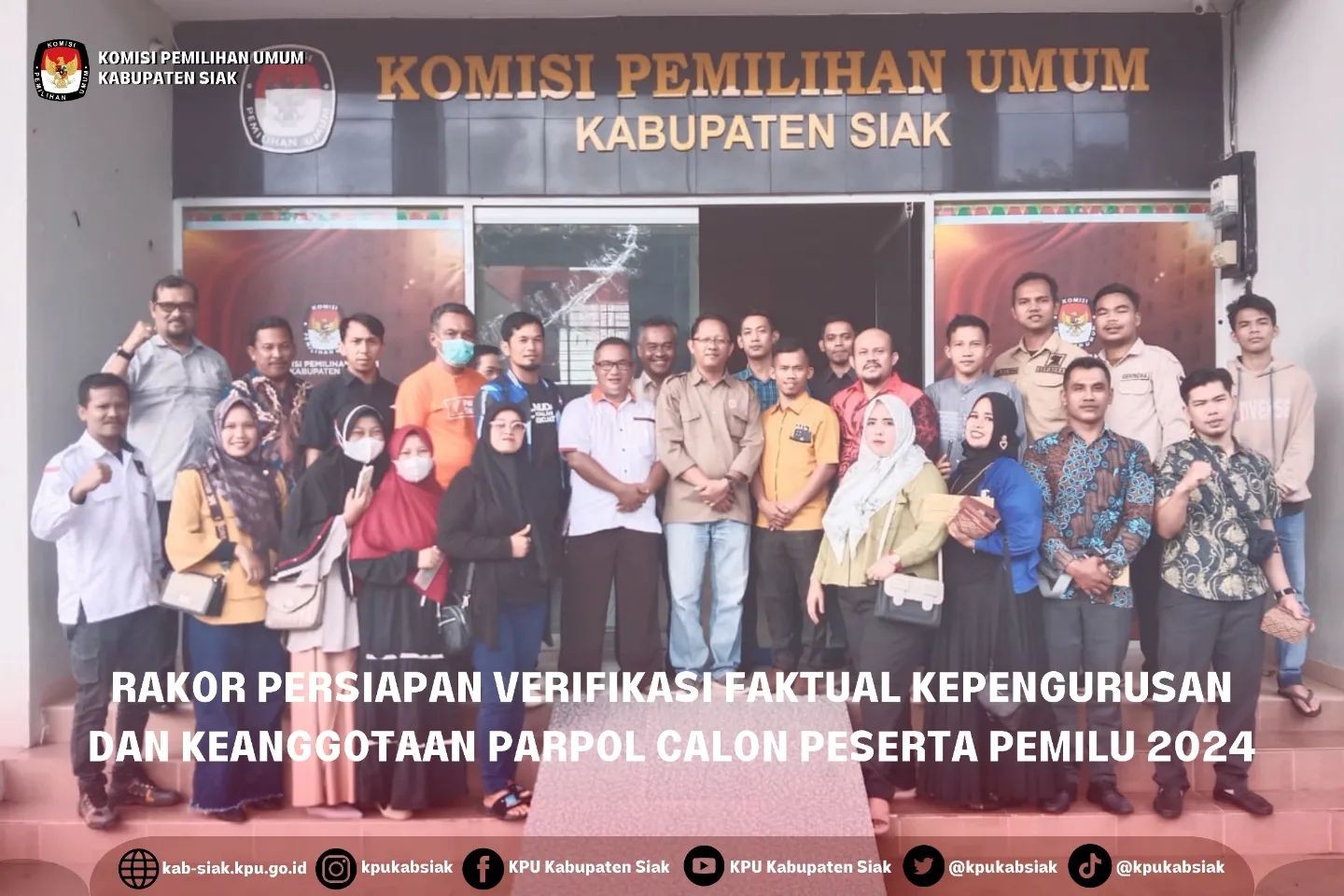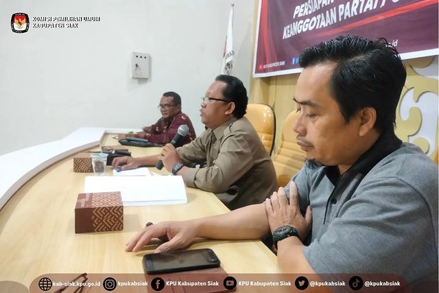 Plh Ketua, Agus Haryanto, membuka Rapat Koordinasi Persiapan Verifikasi Faktual Kepengurusan dan Keanggotaan Partai Politik Calon Peserta Pemilu Tahun 2024 di Kab. Siak, turut mendampingi Kordiv Hukum dan Pengawasan, Susilo, serta Kordiv SDM dan Sosparmas, Berlian Littaqwa.