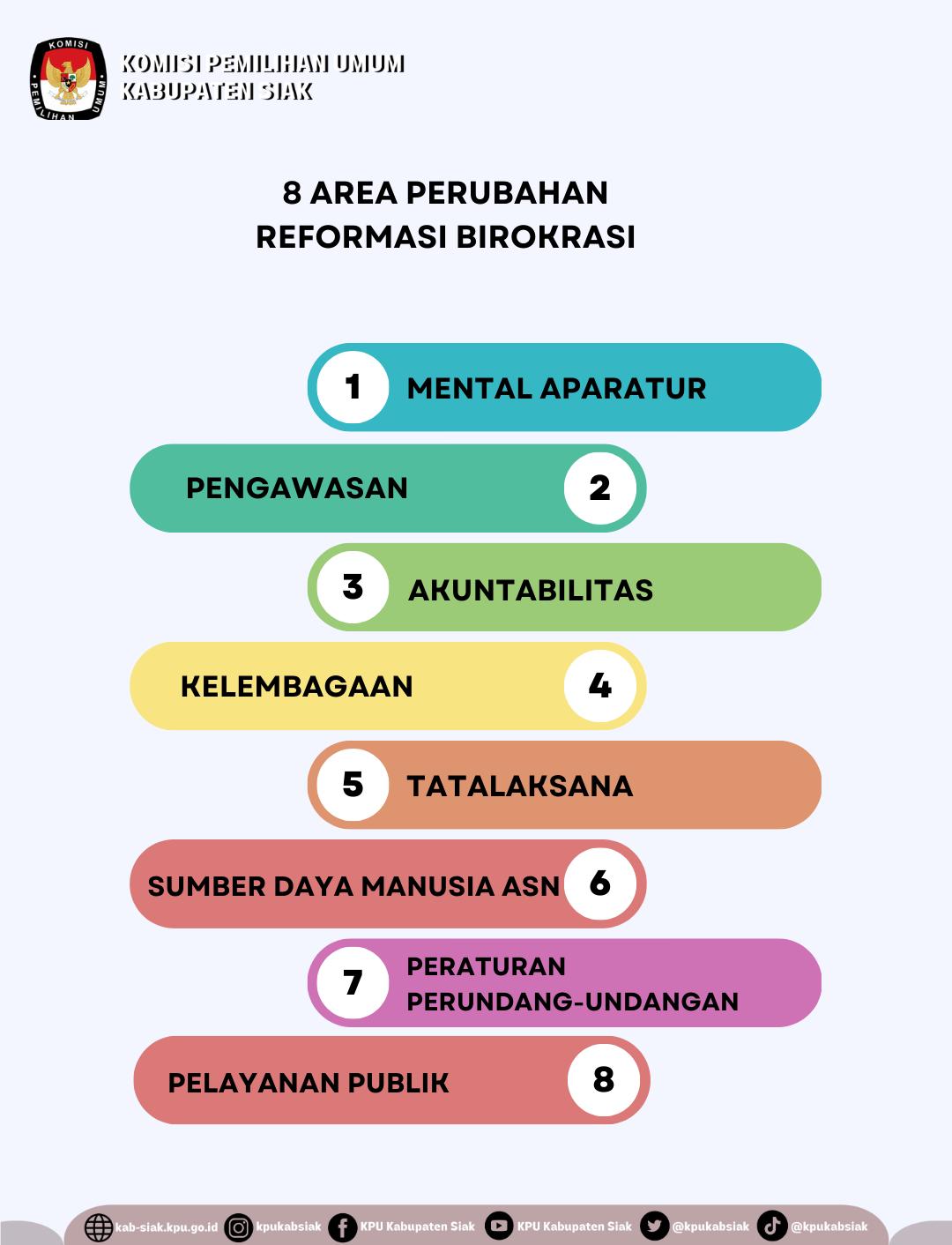 Sejalan dengan arah kebijakan KPU RI tentang Reformasi Birokrasi maka KPU Kabupaten Siak telah melaksanakan reformasi sesuai dengan perubahan dan pembaruan yang lebih baik pada 8 (Delapan) area perubahan sesuai sasaran dan indikator keberhasilan yang ditetapkan dalam pemerintah melalui Permen PAN dan RB Nomor 25 tahun 2020 Tentang Road Map Reformasi Birokrasi 2020-2024.