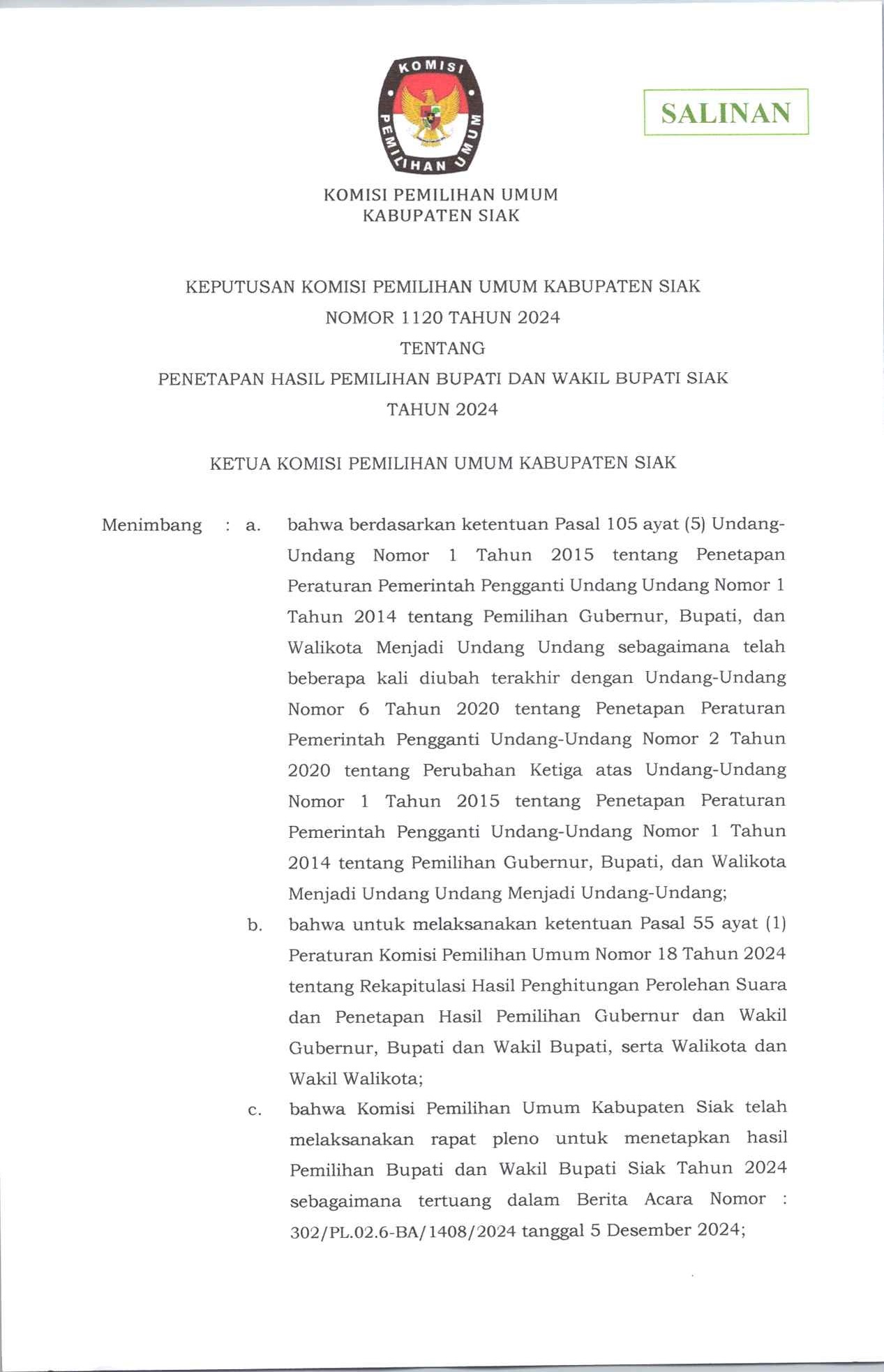 SALINAN SK 1120 TAHUN 2024 TENTANG PENETAPAN HASIL PEMILIHAN BUPATI DAN WAKIL BUPATI SIAK TAHUN 2024
