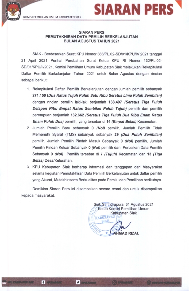 Siaran Pers Pemutakhiran Data Pemilih Berkelanjutan Bulan Agustus Tahun 2021