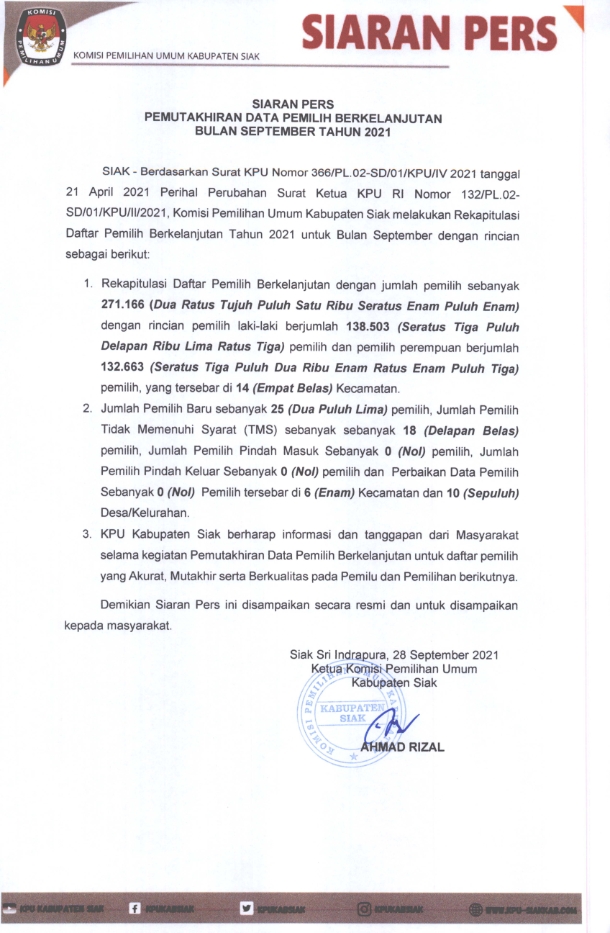 Siaran Pers Pemutakhiran Data Pemilih Berkelanjutan Bulan September Tahun 2021
