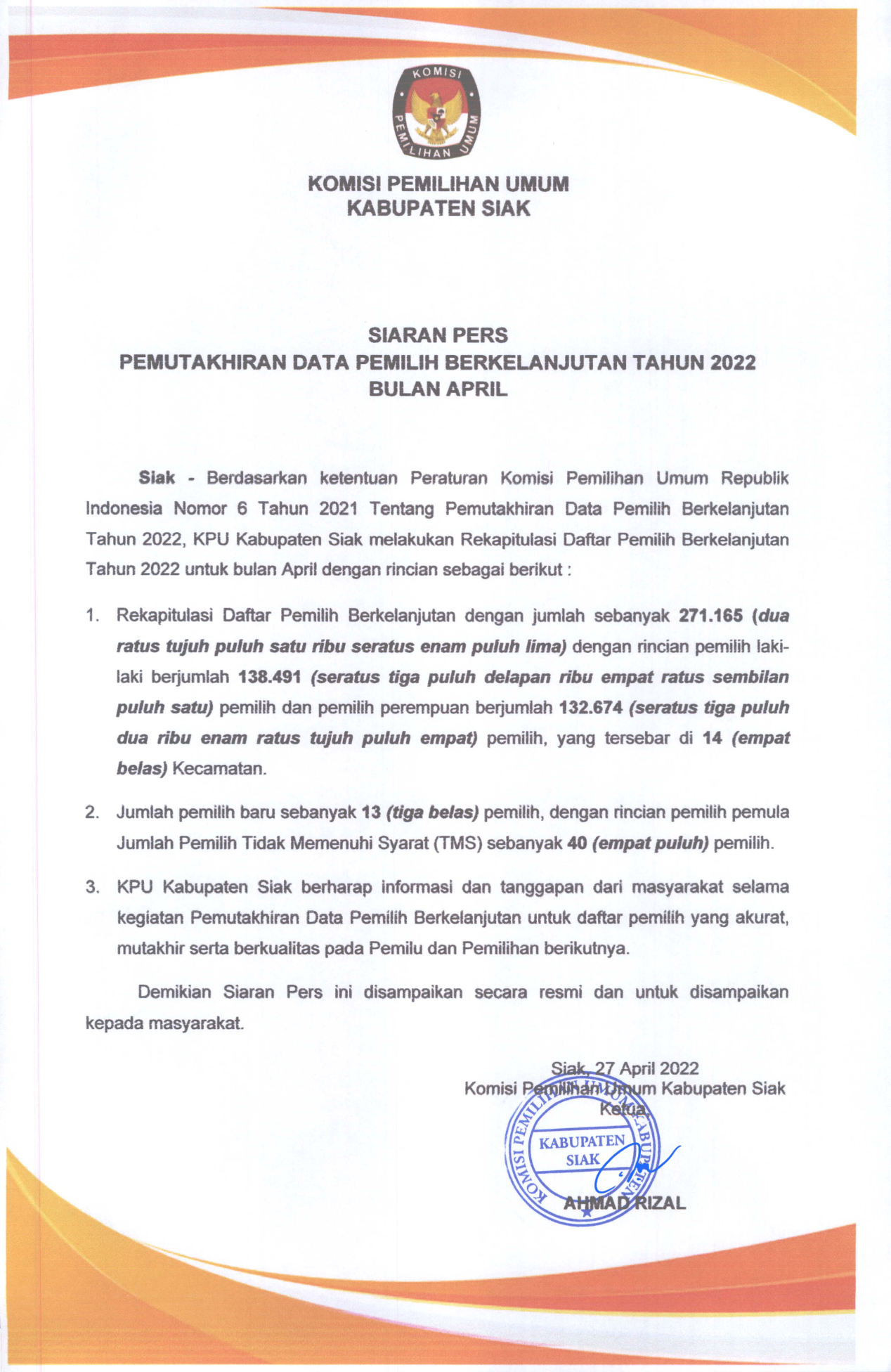 Siaran Pers Rapat Rekapitulasi Daftar Pemilih Berkelanjutan Bulan April Tahun 2022