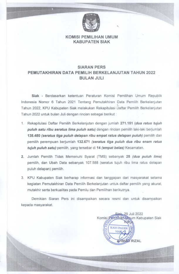 Siaran Pers Rapat Rekapitulasi Daftar Pemilih Berkelanjutan Bulan Juli Tahun 2022