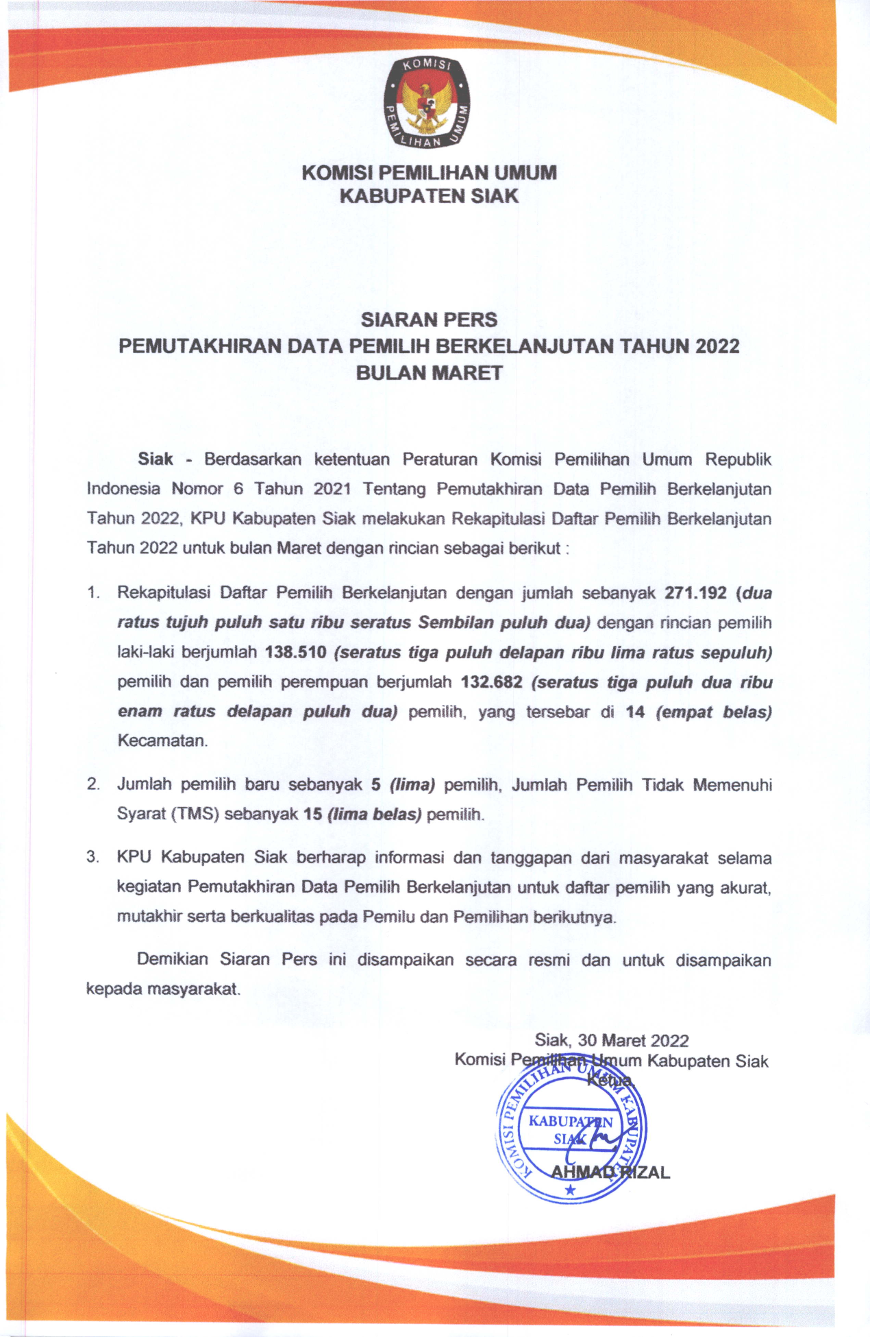 Siaran Pers Rapat Rekapitulasi Daftar Pemilih Berkelanjutan Bulan Maret Tahun 2022