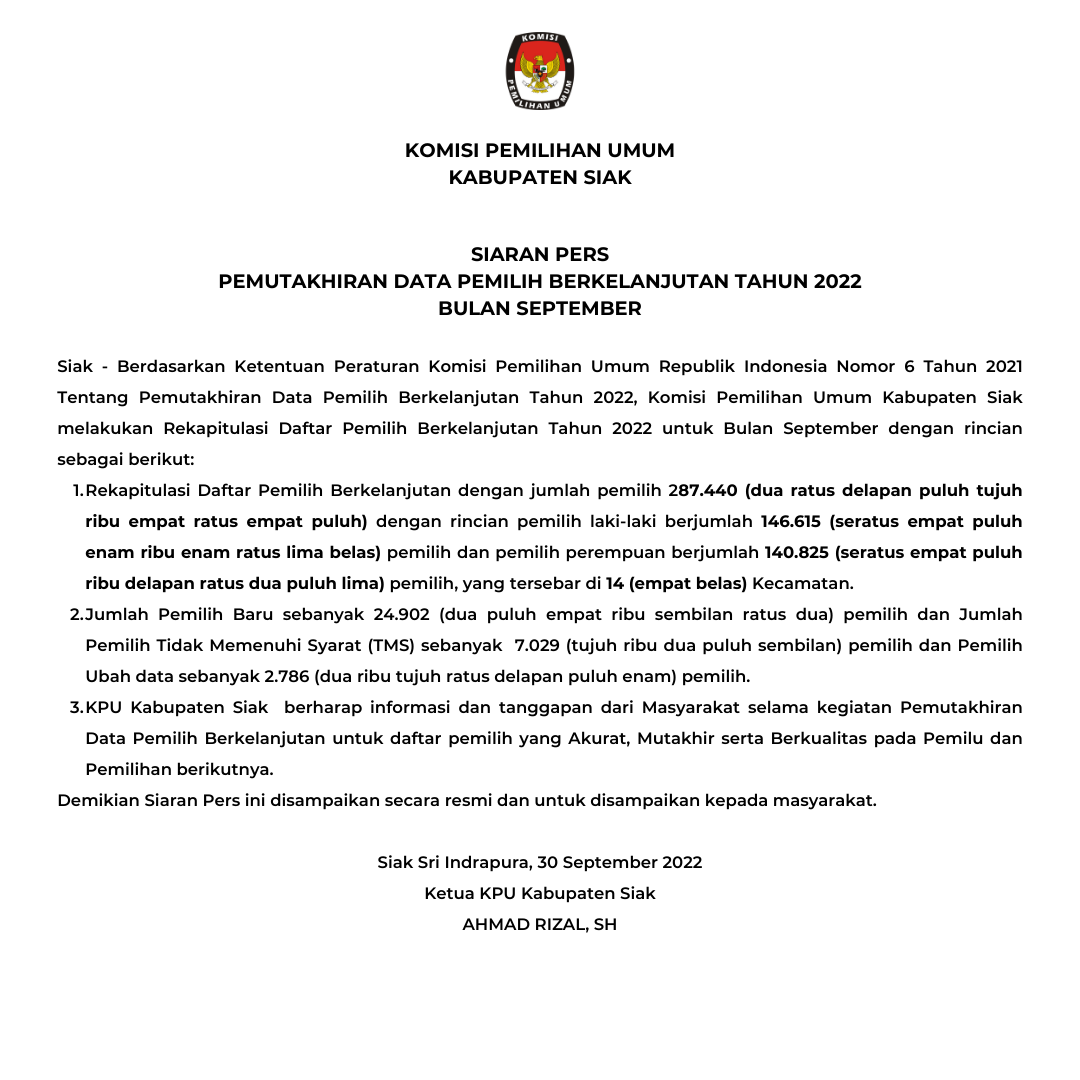 Siaran Pers Rapat Rekapitulasi Daftar Pemilih Berkelanjutan Bulan September Tahun 2022