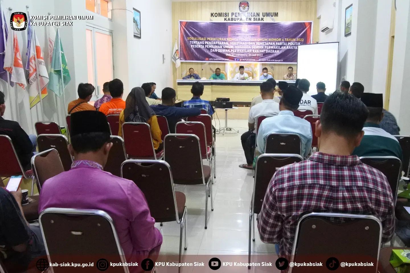 KPU Kabupaten Siak telah melaksanakan sosialisasi PKPU 4 Tahun 2022 tentang Pendaftaran, Verifikasi, dan Penetapan Parpol Peserta Pemilu Anggota DPR dan DPRD pada Pemilu 2024 pada Hari Jumat, 29 Juli 2022. PKPU ini merupakan aturan main bagi setiap parpol yang akan melalui tahapan pendaftaran pada tanggal 1 hingga 14 Agustus 2022 nanti. Di dalamnya dijelaskan secara rinci terkait persyaratan maupun keanggotaan parpol sebagai prasyarat yang harus dimiliki oleh parpol untuk berlaga dalam Pemilu 2024 mendatang.