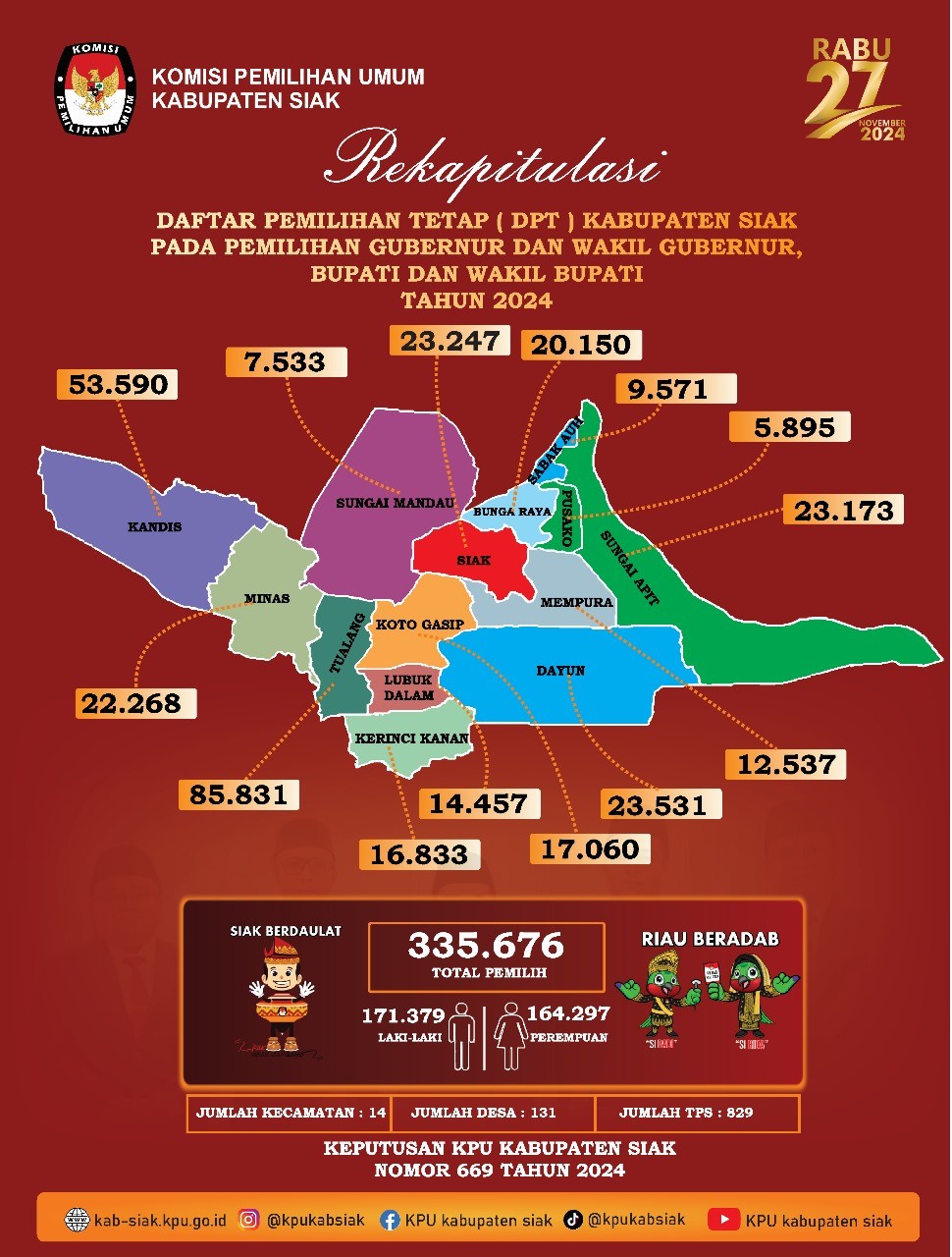 Siak, 20 September 2024. KPU Kabupaten Siak menetapkan Daftar Pemilih Tetap dalam Penyelenggaraan Pemilihan Gubernur dan Wakil Gubernur, Pemilihan Bupati dan Wakil Bupati Siak Tahun 2024 sebanyak 335.676 Pemilih. Berikut kami Umumkan Surat Keputusan Komisi Pemilihan Umum Kabupaten Siak Nomor : 669 Tahun 2024 tentang Penetapan dan Rekapitulasi Daftar Pemilih Tetap Kabupaten Siak Provinsi Riau dalam Penyelenggaraan Pemilihan Gubernur dan Wakil Gubernur, Pemilihan Bupati dan Wakil Bupati Siak Tahun 2024